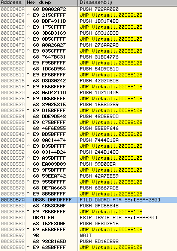 在Dump点的代码如图。连续的PUSH/JMP代码,JMP的目的地址相同。代码下面是这块被保护代码(stolen codes)对应 PCODE数据地址信息。