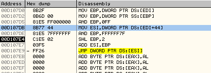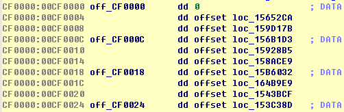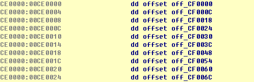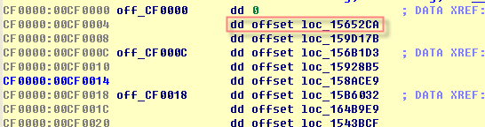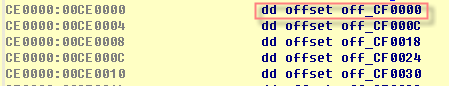 假设Byte2为1,定位到CF0000处3个dword的第2项,即handler地址。2个byte 实际就是2字节opcode编码(00 01)。