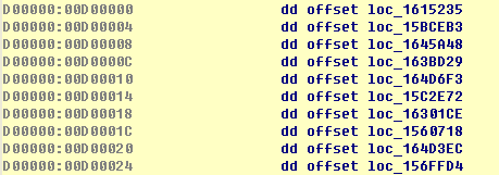 Handler地址表,每3个地址为1组,被上面表内某项所指。非0值代表1个handler地址,共158项。