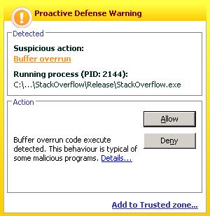 在卡巴现有的检测中还是有一个Bug,就是TEB中的栈基址和栈顶数据是不可信的,应当在初始化时保存,而不应每次都去重新获取,当然这种检测机制本身就是不可靠的,需要改进,这就是本文要提出的基于栈指纹检测缓冲区溢出,说白了就是利用特征码+API Hook来更可靠的检测栈溢出的发生,防止迂回绕过我们的检测,因为有一点是肯定的:栈溢出发生时Shellcode是在栈中的,这个想法也是借鉴自反病毒的概念。微软公司在VC7开始提供了一个/GS编译选项来防止栈溢出带来的危害,但是事实证明还是能被绕过,例如:覆盖SEH。笔者认为安全产品做的越前端就越不容易被绕过,比如拦截Shellcode的行为肯定要比拦截溢出的发生有效的多。