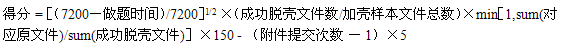 例:选手甲在 2007-9-5 12:00 第二次提交脱壳机。加壳文件10个。脱壳机成功脱了9个。9个脱壳文件的总大小为100000字节,而此9个文件对应原文件大小为90000字节。则分数为: