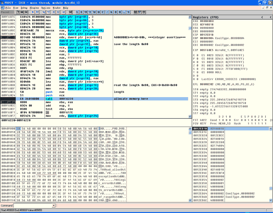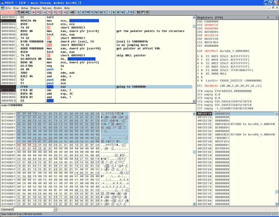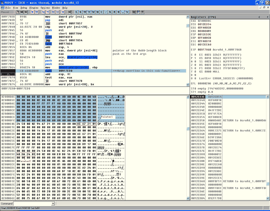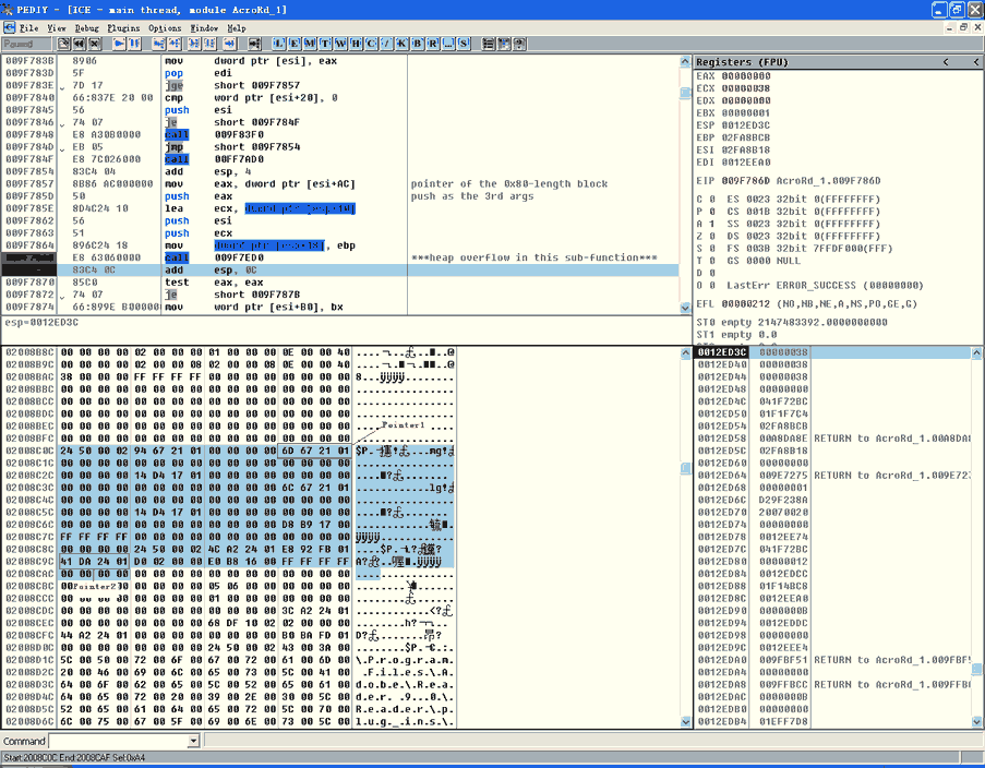 Breakpoint 0 hit eax=02008b1c ebx=00000001 ecx=0012ed54 edx=0438afcb esi=0438af18 edi=0012eea0 eip=009f7868 esp=0012ed3c ebp=0438afcb iopl=0 nv up ei pl nz na pe nc cs=001b ss=0023 ds=0023 es=0023 fs=003b gs=0000 efl=00000206 AcroRd32!AVAcroALM_IsFeatureEnabled+0x63e09: 009f7868 e863060000 call AcroRd32!AVAcroALM_IsFeatureEnabled+0x64471 (009f7ed0) 0:000> dd esp 0012ed3c 0012ed54 0438af18 02008b1c 00000000 0012ed4c 0210b734 01f2b424 0438afcb 00a8da8e 0:000> dd 02008b1c+80+90 02008c2c <b>0124da40</b> 00000544 0017ee98 ffffffff 02008c3c 00000000 00000000 00000000 00000000 Breakpoint 1 hit eax=00000000 ebx=00000001 ecx=00000038 edx=00000000 esi=0438af18 edi=0012eea0 eip=009f786d esp=0012ed3c ebp=0438afcb iopl=0 nv up ei pl nz ac po nc cs=001b ss=0023 ds=0023 es=0023 fs=003b gs=0000 efl=00000212 AcroRd32!AVAcroALM_IsFeatureEnabled+0x63e0e: 009f786d 83c40c add esp,0Ch 0:000> dd 02008b1c+80+90 02008c2c <b>0124da41</b> 00000544 0017ee98 ffffffff 02008c3c 00000000 00000000 00000000 00000000