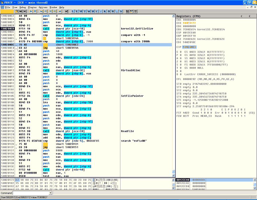 很明显的是,ShellCode通过使用API函数GetFileSize对从0开始的每个句柄同目标大小进行比对,以此找到PDF文档的句柄。