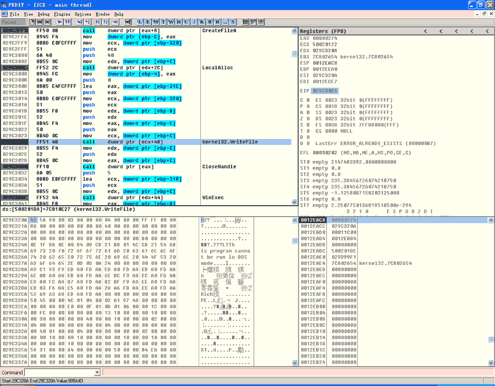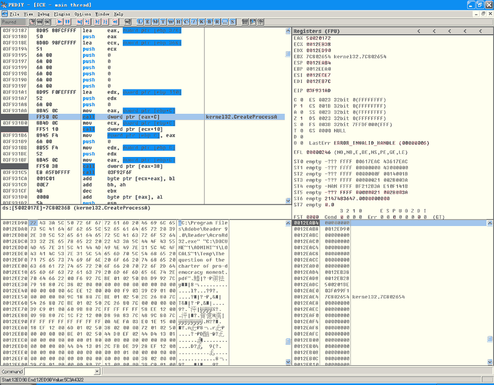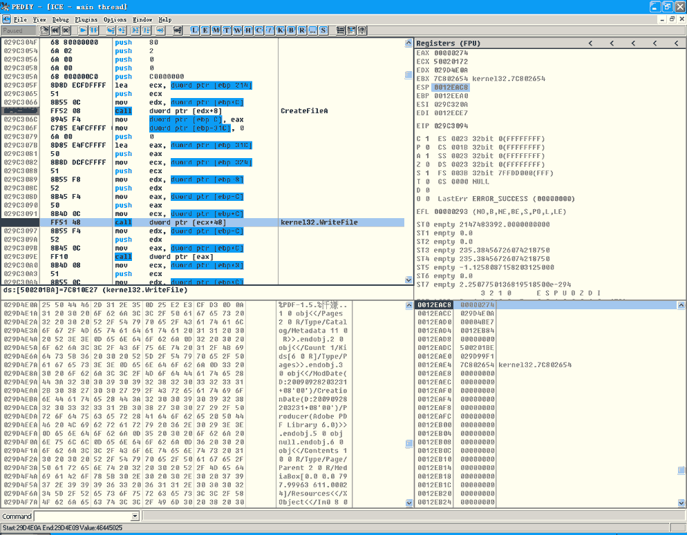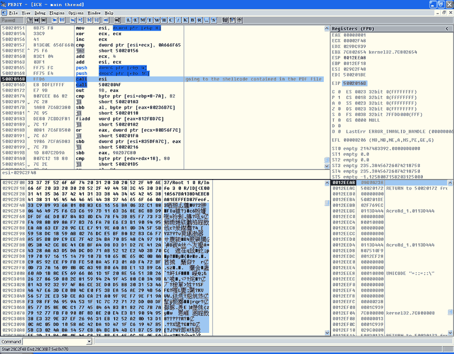 接着,通过已经获得的文件句柄去找到并执行新的已经嵌入在PDF文档中的ShellCode: