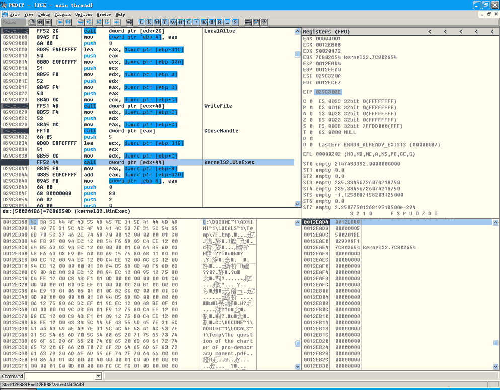 2).从初始PDF文档中生成一个正常的PDF文档,并使用Adobe Reader 打开并使用同样正常的文档内容覆盖当前打开的恶意PDF文档:以取得完美的伪装效果。从结果来看,伪装文件的名字为:“The question of the charter of pro-democracy moment.pdf”,存放在系统Temp目录下。