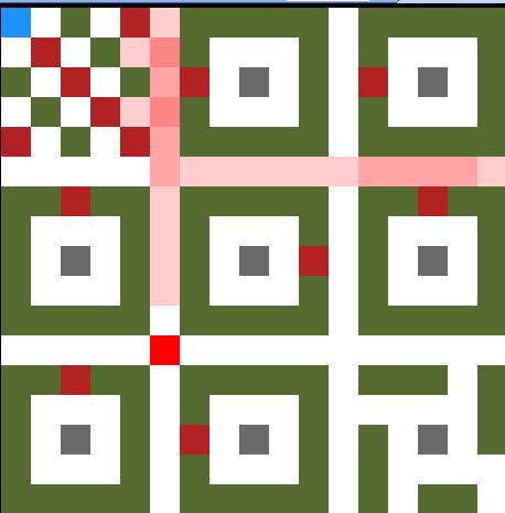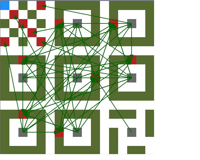 图中绿色的带箭头的线表示灰色的开关所能的打开红色的门。算法要经过若干个门后才能进去左上角的终点。