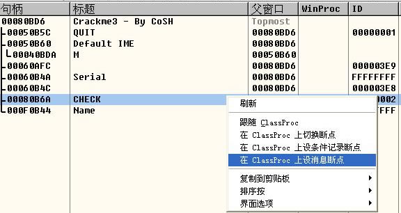 3、用OllyICE打开,点运行程序(弹出程序界面,不理它)--点查看菜单--窗口(点右键刷新一下)--单击“CHECK”那一行--点右键,选消息断点--选“202 WM_LBUTTONUP”--确定,如下图: