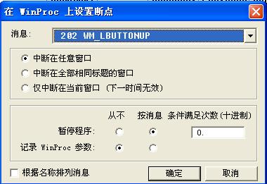 答:我现在的目的是要设断点,本来可以根据它的错误提示找到它的参考来设断,不过这种设断方式中断后,它是停在算法分析的后面,无法判断算法是从何处开始的,如果要爆破的话就可以用这种方式,但我们现在是要完整分析它的算法,所以我想,注册码的分析一定是在点了check,松开时开始的,而在弹出出错窗口结束,那么我就把它限定了这个范围,下面我们的任务就是要找出这个范围的开头。那么我设下了这个消息断点,意思就是一松开check键后就中断。