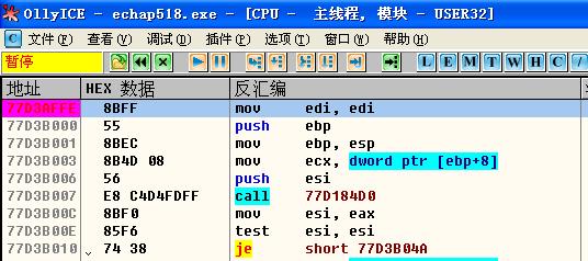 9、双击每一行,都会跑到反汇编窗口,会出现被选择的块(如下图),在每一下块的块首按F2设断,统计窗口共有五行,就设五次。