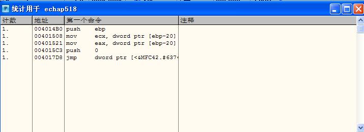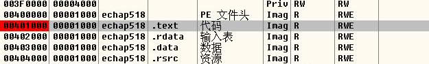 答:你进到内存窗口后,发现是echap518这个属主只有五行,echap518就是我们的程序名了,我们要的就是返回到这,区段这里显示四种,因为我们是要分析它的执行代码,所以我们就选.text那一行设断了。那这样我们再点运行程序后,它就是断在echap518程序领空了。