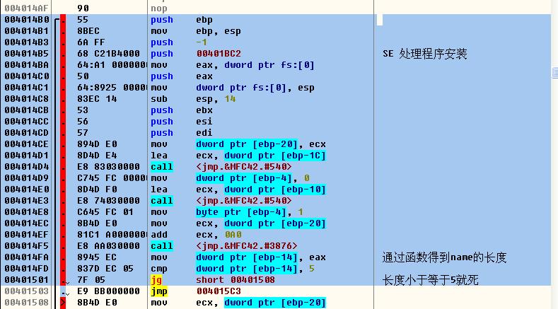 004014FA |. 8945 EC mov dword ptr [ebp-14], eax ; 通过函数得到name的长度