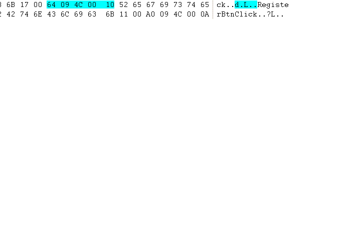2、用Winhex 打开主程序,搜索“registerbtnclick”,字节"10"指出了“registerbtnclick按钮的长度,前面
