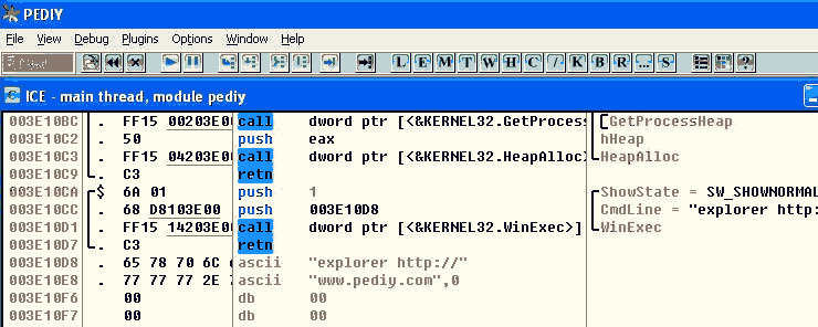 1) 在pediy.dll文件4e0h处添加: 68 74 74 70 3A 2F 2F 26 62 73 2E 70 65 64 69 79 2E 63 6F 6D 00