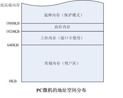 在实模式下,8086/8088有1021KB的内存地址空间,80x86有1088KB的内存空间。注意,这里提及的,都是地址空间,而并非物理地址。地址空间指处理器的地址线所能表示的寻址范围。而地址空间可及,并不代表物理地址可及,这得依赖于系统中安装内存的大小。
