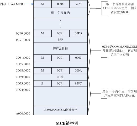 于是,由一个MCB提供的信息,便可找到其后续的MCB的位置,系统的全部MCB顺序组成一个MCB链。