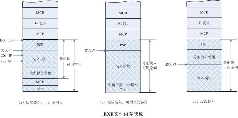 只要可用内存空间容量不小于装入模块本身长度与PSP长度(10h节)之和,即可装入、此时1Bh号系统功能把全部可用内存空间都分配给此.EXE文件。装入模块的最高地址与可用空间的最高地址相重合。但装入模块的最低地址与PSP之间可能有一个示使用的空闲区,如上图(c)所示。装入起点的段址等于分配块段址加分配块长减去装入模块长。