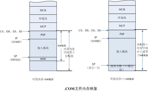 .COM文件无头部信息块,只有一个无需重定位的、长度不大于64KB的装入模块(实际上不能大于65280字节)。4Bh号系统功能装入.COM文件时也要测试当前可用内存空间容量,并且要求其容量大于PSP长度(100h字节)与文件实际长度(采用实读方式来判断)之和,否则装入出错。
