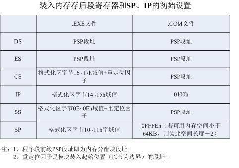 .EXE文件和.COM文件装入后,系统对各寄存器的设置情况如下表: