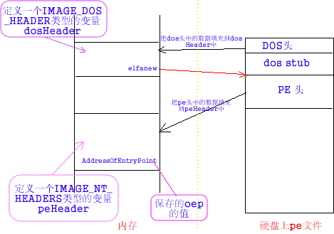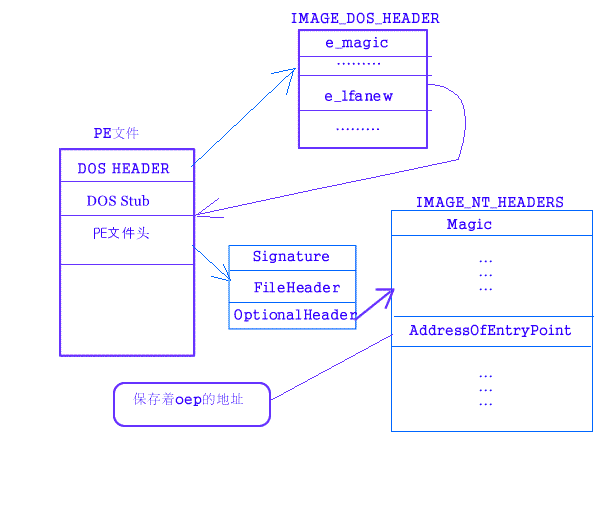 Oep是保存在AddressOfEntryPoint里面的,这个是OptionalHeader中的一个成员,OptionalHeader是pe头的中的一个成员,所以只要获取了pe头peHeader,那么(peHeader.OptionalHeader).AddressOfEntryPoint就是oep的值了,而pe头怎么获取呢,在dos头中有一个e_lfanew里面保存的是pe头的地址,那么就要获得dos头,那么dos头该怎么获取呢?如果你也有这样问,而且没有想到答案的话,可以知道,你的编程水平的确有待提高,或者要多写点代码了。