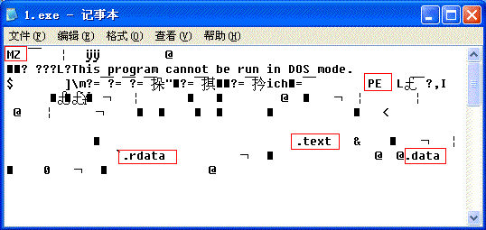 可以看到里面有MZ 、PE,分别是DOS头标志和PE头标志,还有几个段(也就是节区)的标记。从中可以知,有些信息我们还可以从记事本里看得到的,我们甚至可以直接在记事本里修改一些信息而不会破坏程序的运行,然由于编码问题,大多数情况下会破坏pe文件的结构,从而导致pe文件无法正确地执行。