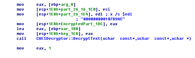 调用CAESDecryptor::DecryptText,将part_26用part_5作密钥来解密