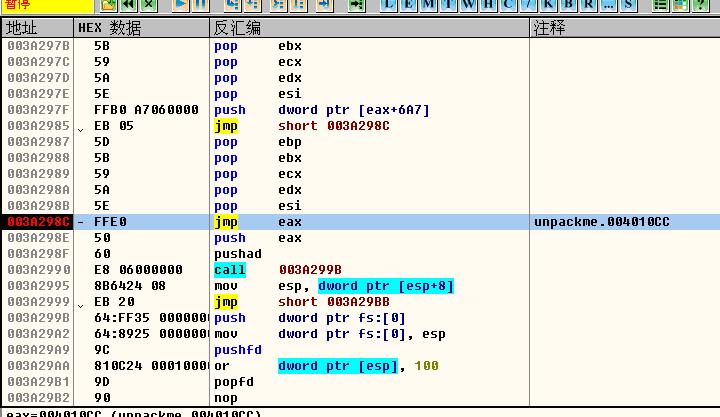 3、 CTRL+F查找跳到OEP的命令 JMP EAX, 在其上F2下断点,SHIFT+F9运行: