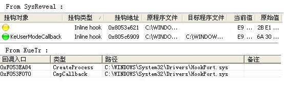 使用anti rootkit检测工具可以看到360保险箱对系统内核做了如下两处inling hook,并设置了两处系统回调,如图: