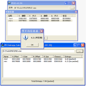当你将这套代码做测试的时候,你会发现它的误判和漏判率非常的高。当我发现这个情况的时候,我尝试使用PEiD来对比,结果让我大吃一惊。PEiD计算的Entropy和用小喂代码计算的Entropy竟然完全不一样!(貌似计算一个Section的Entropy是一样的)而且PEiD判定的命中率非常之高。