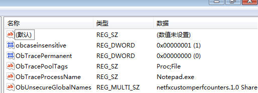 WCHAR ObpTracePoolTagsBuffer[128] = { 0 }; //Tag标志,最多32个,凡是与该Tag匹配的对象被引用时才会被跟踪,详见gflags程序