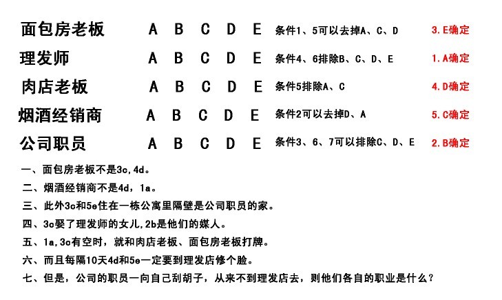 如果:一、面包房老板不是3c,4d。二、烟酒经销商不是4d,1a。三、此外3c和5e住在一栋公寓里隔壁是公司职员的家。四、3c娶了理发师的女儿,2b是他们的媒人。五、1a,3c有空时,就和肉店老板、面包房老板打牌。六、而且每隔10天4d和5e一定要到理发店修个脸。七、但是,公司的职员一向自己刮胡子,从来不到理发店去,则他们各自的职业是什么?
