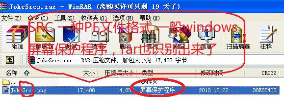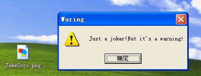 下面我将提供一个非病毒的样本,里面内容就只有一句MessageBox。该样本是一个rar文件,打开rar后,你可以看到一个JokeSrcs.png。将它解压出来,资源管理器里面也是JokeSrcs.png,这时候你可不能大意,不要以为看见扩展名是png,就是安全的。实际上这个文件的真实文件名是“Joke?gnp.scr”,你没有看错,文件名里面有一个问号,ascii码是3F的问号,但是由于系统的漏洞或者其他什么原因问号后面的部分将被反向显示,gnp.scr反向那就是rcs.png。scr是屏幕保护程序,它拥有和exe相同的执行权限,如果你不小心双击,那么你就中招了。