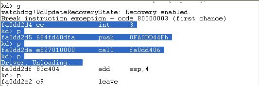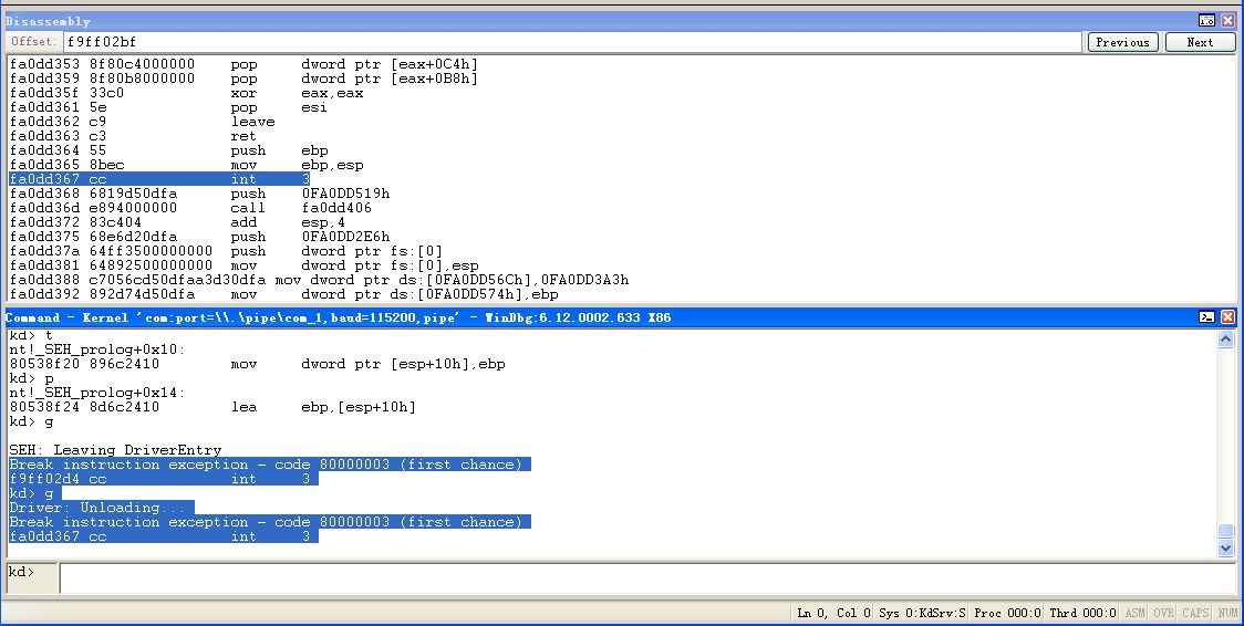 这时WinDbg中出现fa0dd367 cc int 3这条指令其实就是我们汇编代码中DriverEntry函数前面的那条指令,接下来我就只看WinDbg的内容,进行讲解(因为我的电脑实在太破,无法在这两个程序中不停的Alt+Tab)