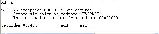 在FA0DD2C1处发生异常,并且是从EAX=0处读异常导致SEH异常的处理!