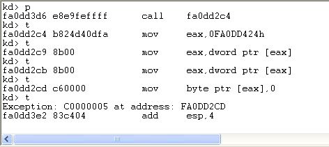 fa0dd2cd c60000 mov byte ptr [eax],0 ;写异常