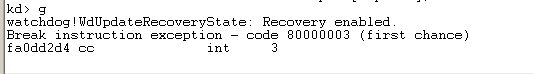 当调试器正常运行之后,我们将seh.sys拖到虚拟机中,然后使用KmdManager加载seh.sys驱动,这里WinDbg会断下来,这时就是我们在DriverEntry中的int 3起作用了,注意这个操作一定要在调试机上操作,不然会Blue Screen~~呵呵!