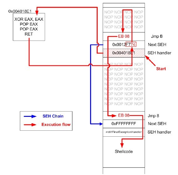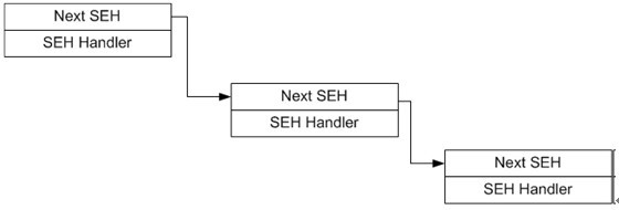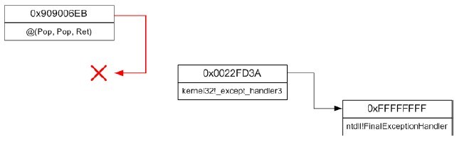 每一SHE结构均拥有指向下一个SHE结构的指针,后面再连接一个指向ntdll!_except_handler4的异常处理函数指针。在通过覆盖SHE结构的栈溢出中,next SHE指针被一些字节码覆盖,而SHE handler被一个指向pop pop ret指令串的地址覆盖掉,该指令串位于一个non-SafeSEH模块中。