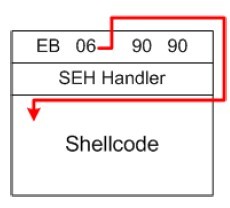 SHE handler指向POP POP RET指令串,next SHE中的栈地址被jmp 06 nop nop(机器码:EB 06 90 90)替换掉。当处理一个程序异常时,Windows将控制权传给SHE链表中的异常处理程序。当第一个异常处理函数被覆盖掉后,程序的执行流程重定向到POP POP RET指令串中(代替真实的异常处理函数)。该指令串将执行到当前SHE结构中next SHE的前两个字节(jmp 06),以此直接跳转到我们的shellcode。这样,SHE链表就被拆分了: