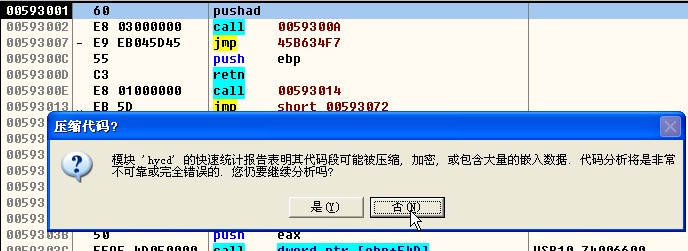 3、 手动脱壳基本方法:从OD载入软件程序后弹出是否分析对话框,点“否”,停在程序壳的入口(含有pushad等类似字符)。接下来我们的目的是要寻找第一个popad 。