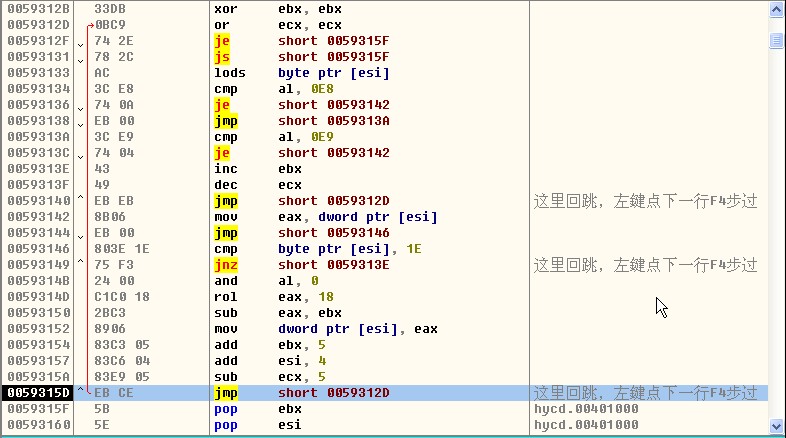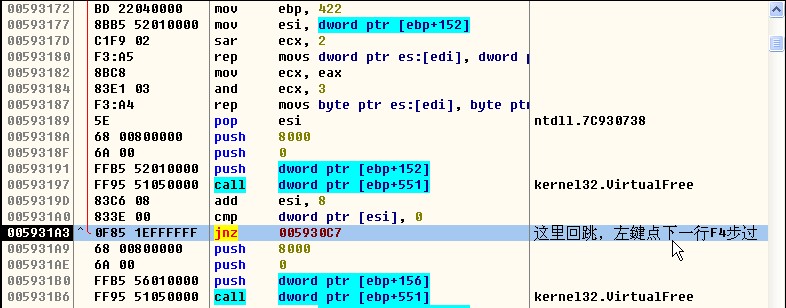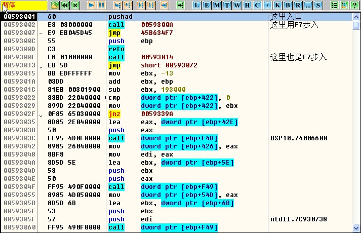 3、接下来第一步按F8、第2步F7(这里的CALL离入口很近哦)、第3步F8……以下按图中的注释操作,未注释用F7或F4的则,全部用F8。