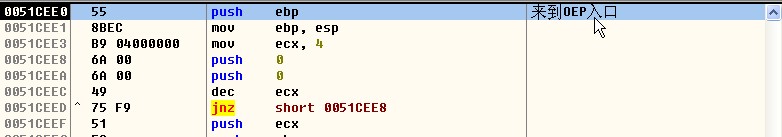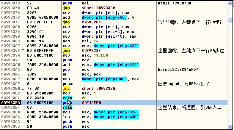 从上面程序返回直接跳到这里,这就是典型的OEP入口了。