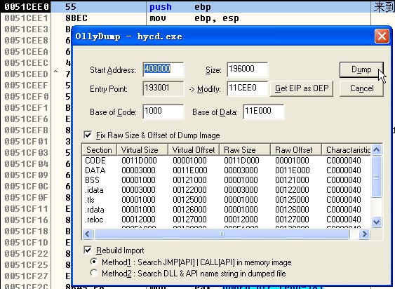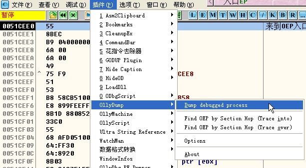 (3) 其他全部F8,一路下去必定能找到第一个popad,找到后离此不远必定有一个大的跳转,一旦跳转来到有push ebp字样,说明壳己走完到主程序(OEP),在此用OD插件→ollyDump→Dump debu…→Dump脱壳→保存。