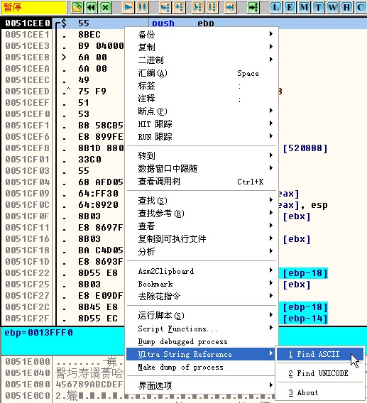 5、 鼠标置左上(反汇编)窗口点右,弹出框选项中选择ultra string reference(过激的字符串参考)中的Find ASCII。