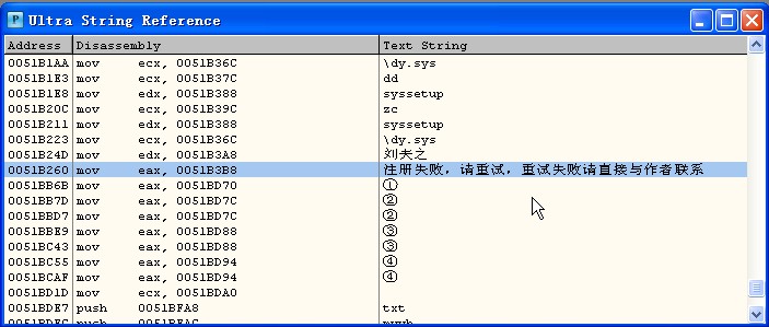6、 在弹出的窗口内查找第一步骤的注册信息内容或有关注册成功和注册失败的字符。如果找不到,建议你放弃,另选其他软件,最好是年纪大些的(一般在2005年及以前的)。