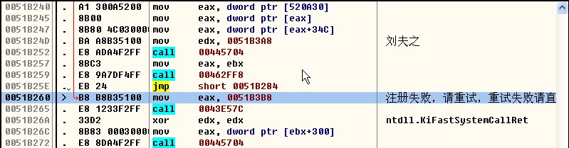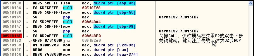 4、 找到这里,0051B153跳向注册失败,必是关键跳转了,它上面的CALL一般都是关键CALL(因为是初学我们暂不进入跟踪算法)。