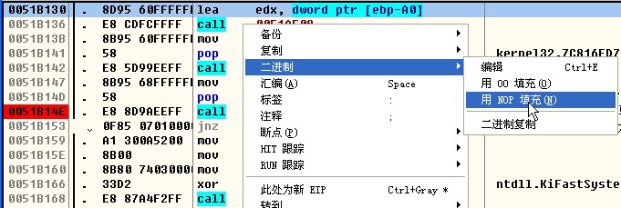 (1) 爆破:在关键跳转处的jnz改为jz或点右→二进制→用nop填充。