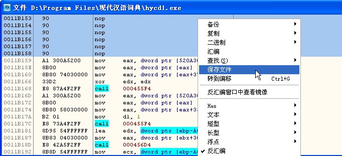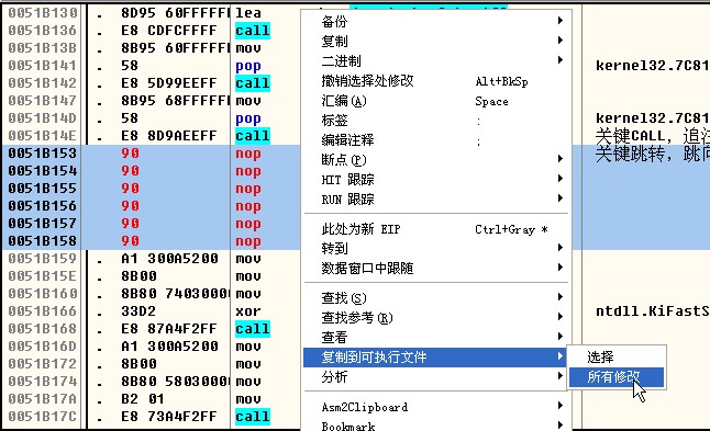 5、 关键跳转修改后,点右→复制到可执行文件→所有修改→(弹出对话框)点全部复制。