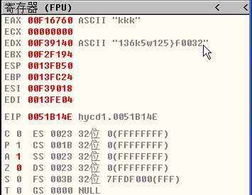 2、查看寄存器窗口,这里显示软件的真假码。KKK为我这里输入的码假,在第三行EDX处显示的为真码(注意:这里的真码与输入的确认码对应)。另须说明:当点确认注册后,OD会陆续弹出几个出错的对话框(说明软件有调用函数,既是初学,这里暂不去深究),可以直接点“否”,打开软件输入对应确认码和真码即可注册成功。