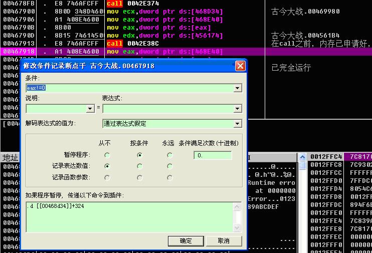 在00467918处下条件记录断点,可直接定位到分配的内存基址。