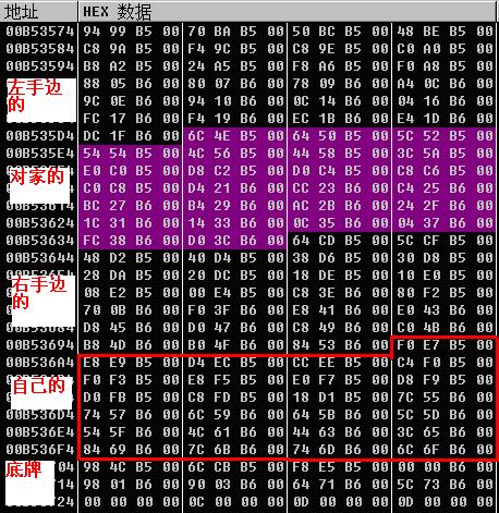 下内存写入断点,就找到了这块保存牌面信息的地方,当eax=1时,即可以算出玩家手中第一张牌保存的地方了,每个双字保存一个地址指针,指向每一张牌: